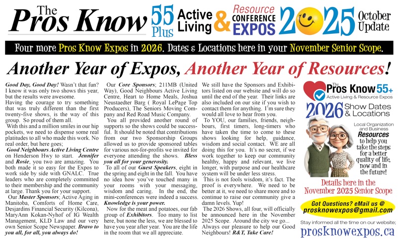 Hello Everyone! First off we wish to thank all involved in the 2025 Pros Know Expos held at Good Neighbours Active Living on Henderson Hwy. Both shows with the 8 Mini-Conference Guest Speakers were a hit and there are so many people to thank for all of it. Here goes, the short version?