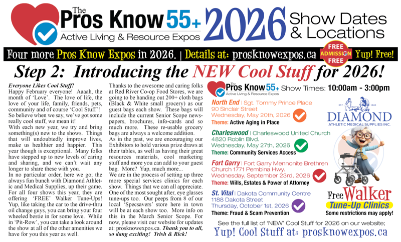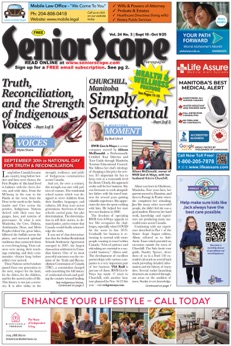 Seniors Health Articles, Seniors Resources Articles, Things to Do Winnipeg & Rural Lists, Crosswords, Word Searches, Senior Centres Listings, Retirement & Personal Care Living, Travel & Leisure, Classified ADs Section, The Pros Know Updates Housing Edition, Legacy Edition, Health & Welfare Edition, Special Cultural Events Listings, Historical Facts Stories and so much more to see and do in Senior Scope!